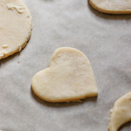Abaissez votre pâte avec un rouleau à pâtisserie et formez des coeurs avec un emporte-pièce.