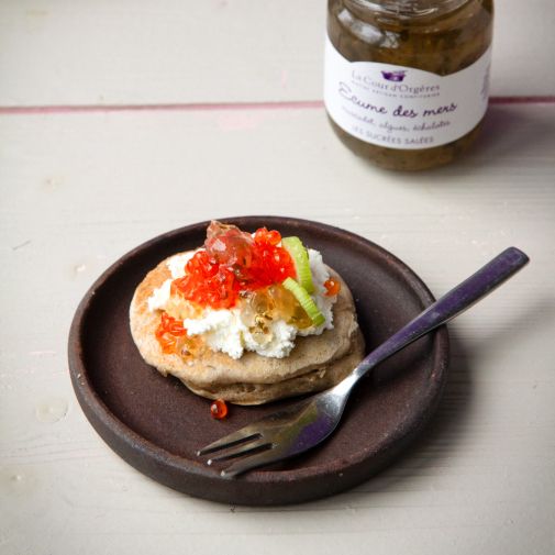 Tartiner de fromage frais, recouvrer d’oeufs de saumon et de gelée de muscadet aux algues.
