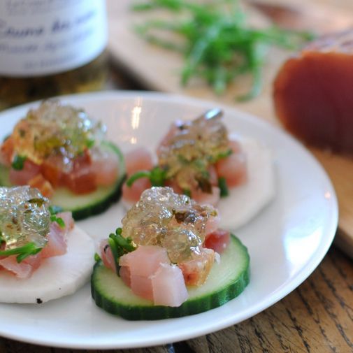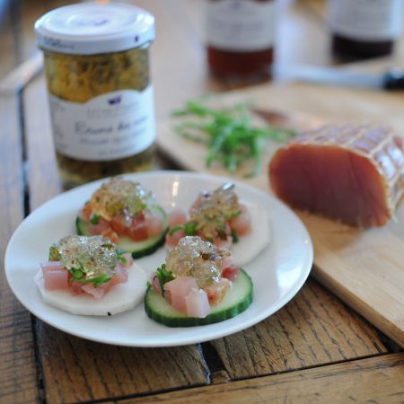 Amuse-bouches de thon fumé artisanal et salicornes crues sur une tranche de radis noir ou de concombre, surmontée de notre Écume des mers : gelée de muscadet aux échalotes bretonnes et aux algues du Croisic.