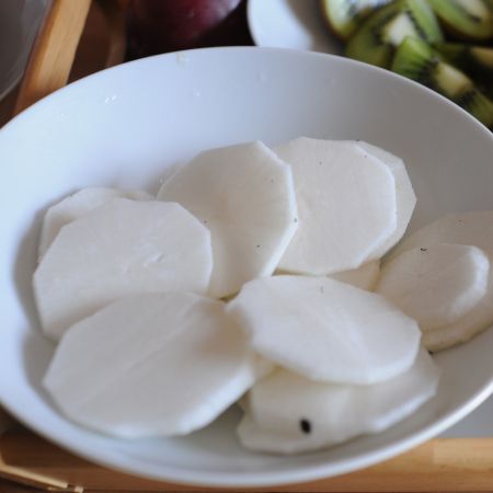 Trancher le concombre et le radis noir à la mandoline en tranche d'environ 3mm.