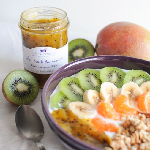 Et pour la touche finale, 1 à 2 généreuses cuillères de notre confiture allégée "Un peu, beaucoup" (kiwis, pêches jaunes) ou de votre confiture préférée.