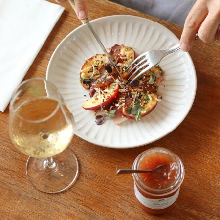 Le Chef du restaurant Brume à Quiberon a imaginé un carpaccio de thon blanc plein de fraîcheur avec notre confiture de brugnons blancs et zestes de citron ! Laissez-vous surprendre par l'harmonie des saveurs de cette entrée estivale.