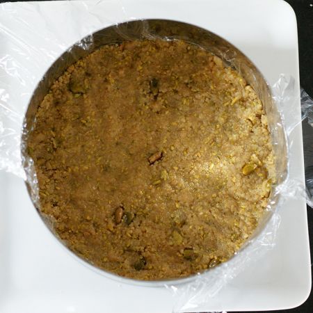 Déposer le mélange au fond du moule (si c'est un cercle, le poser sur votre plat de présentation, sinon il sera très difficile à déplacer, filmer les bords pour aider au démoulage).