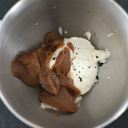 Dans une terrine, battre ensemble (à la feuille au robot, ou au fouet) la confiture de châtaigne et le mascarpone.