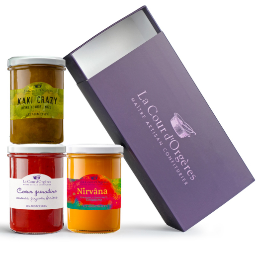 Profitez des derniers pots disponibles, sous forme de coffret cadeau contenant 3 confitures ou préparations de fruits