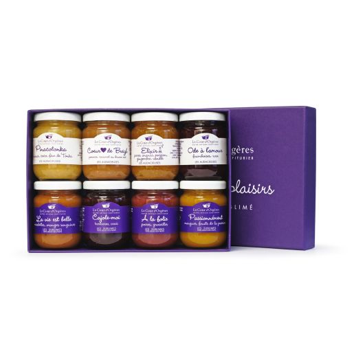 Un écrin cadeau de 8 petits pots-découverte de confitures d'exception qui sont déjà des must-have de La Cour d'Orgères :
