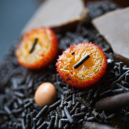 Pour les yeux du chat, découpez les fruits d'arbousier en deux et ajoutez un vermicelle en chocolat pour la pupille.