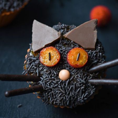 Vous cherchez des idées de recettes pour Halloween ? Craquez pour nos cupcakes chatons diaboliquement irrésistibles ! Faciles à réaliser avec vos enfants, ces petits cupcakes sont simplement fourrés à la confiture de framboises et de mangues. Mais vous pouvez également les faire avec de la pâte à tartiner Résiste-moi ou d'autres parfums de confitures. Côté décoration, faites avec ce que vous avez sous la main : bonbons, biscuits, fruits... Amusez-vous à réaliser cette recette en famille et laissez-libre cours à votre créativité !
