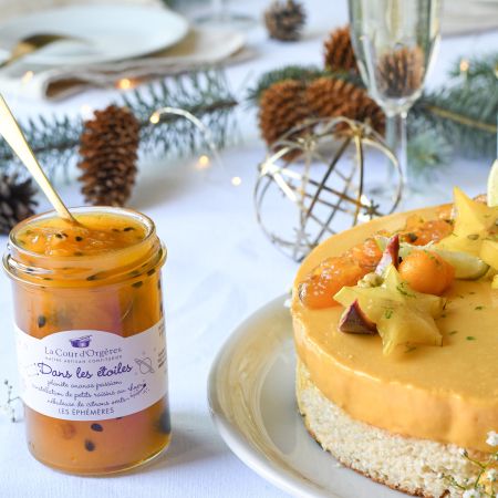 Décorez avec des fruits frais et notre confiture "Dans les étoiles" ananas passion raisins au rhum citron vert.