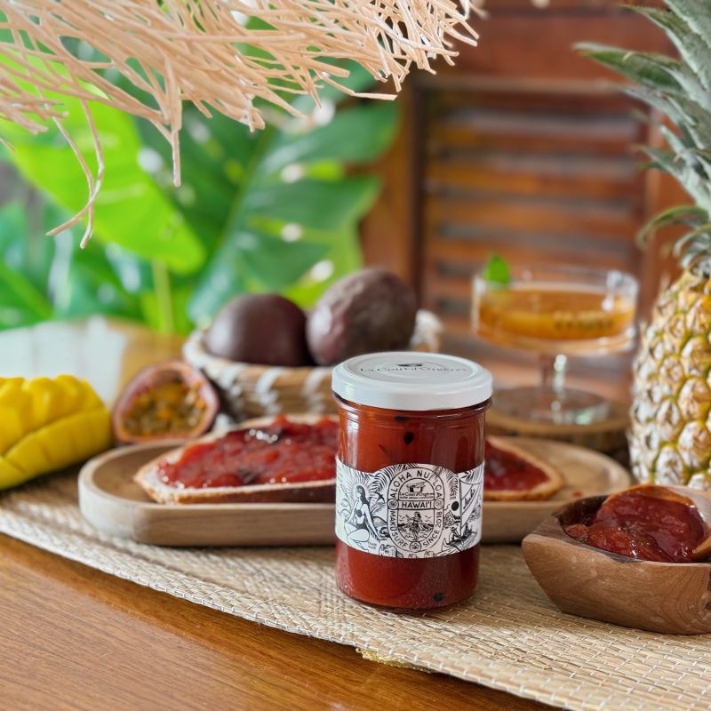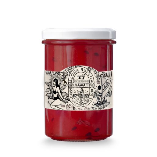 Préparée avec 81 g de fruits pour 100 g de produit fini. Ingrédients : mangue et ananas, fruit de la passion, fleur d’hibiscus, sucre, gélifiant : pectine de fruits.