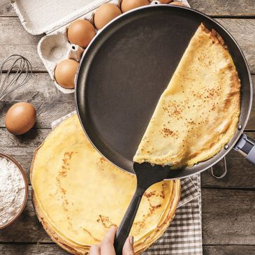 Versez une petite louche de pâte dans votre poêle assez chaude pour saisir la première face puis retourner la crêpe avec une spatule en bois ou bien faites-la sauter !
