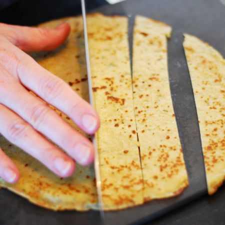 Découper des bandes pour faire des rouleaux dans les crêpes restantes et commencer votre décoration.