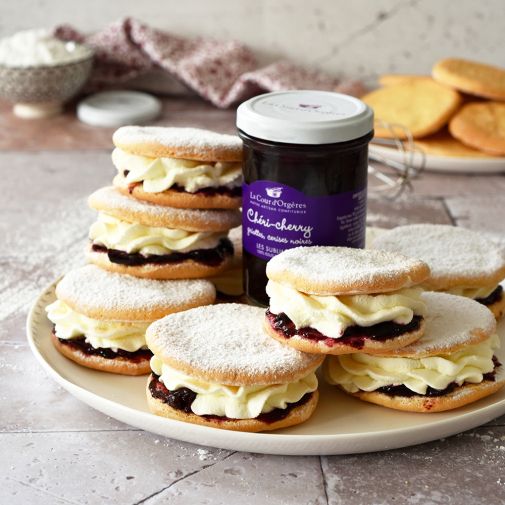 Déposez les biscuits sur une grille, le dessus côté grille. Couvrez-les avec une cuillerée de Chéri-cherry puis avec de la chantilly. Couvrez avec d'autres biscuits puis saupoudrez de sucre glace.
