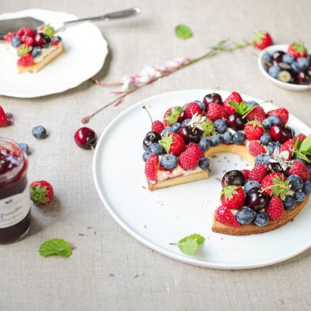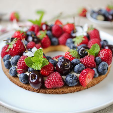 Un florilège de petits fruits rouges délicatement posés en couronne sur une crème vanillée légère et une base de sablé breton pour le croustillant.