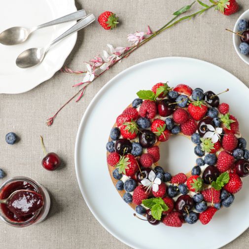 Décorer la tarte couronne avec les fruits rouges en alternant les fruits de façon harmonieuse.