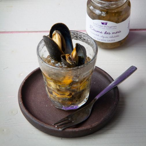 Vous aimez les moules marinières ? Dégustez-les chaudes ou froides dans des verrines accompagnées de notre gelée de muscadet aux algues.