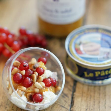 Une délicieuse recette apéro sucrée salée très facile à reproduire ! Pâté Hénaff, confiture Sous le soleil, fromage fouetté, pignons de pin et groseilles fraîches.