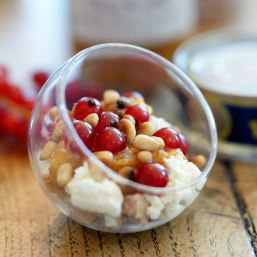 Décorer avec des groseilles égrappées et les pignons de pin grillés.